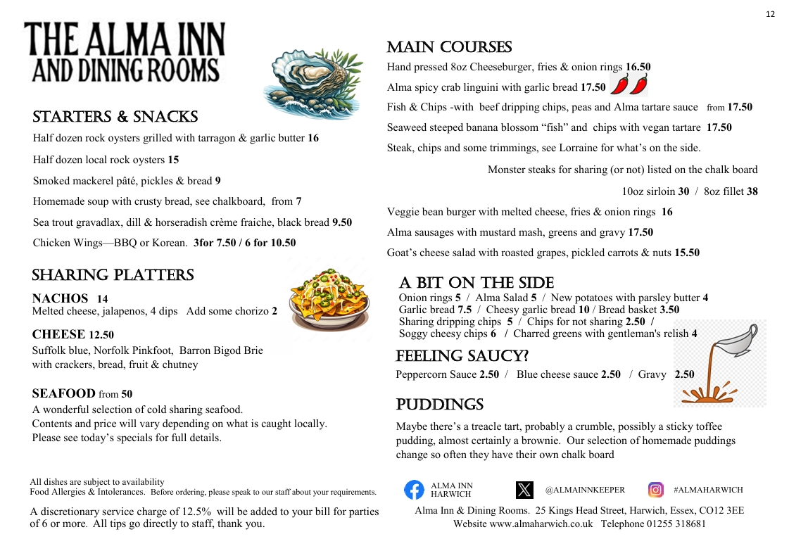 Our kitchen will be open from 12 – 8.30pm Sunday to Thursday and 12-9.30pm Friday & Saturday. The menu below is subject to availability and change but we endeavour to have all the Alma favourites on all the time. We also do roasts on a Sunday with some of the best Yorkies in Essex!